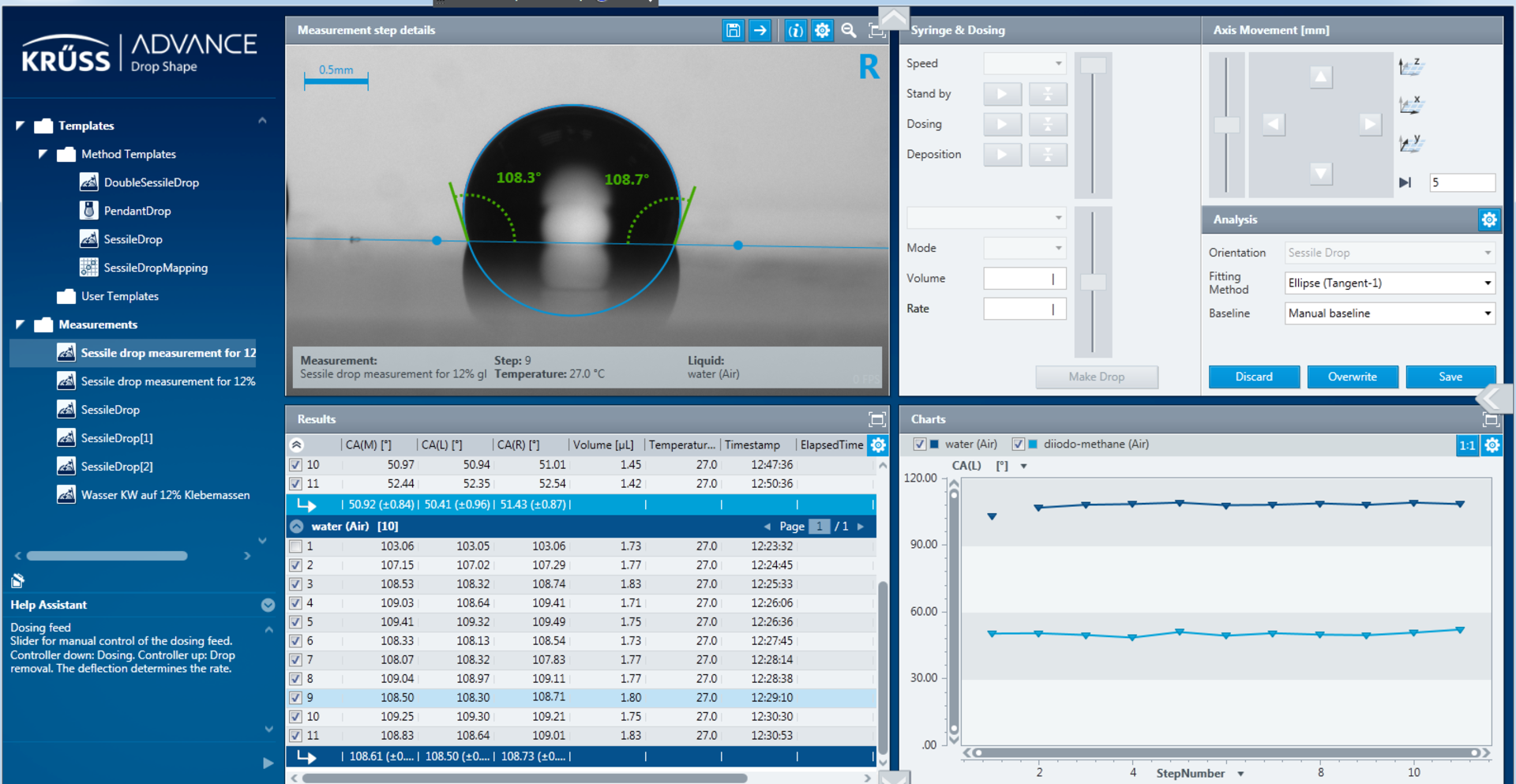 An vereinzelten Proben wurden noch optische Wasser-KW-Messungen am KRÜSS DSA100 unter Verwendung der Sessile-Drop- und der Captive-Bubble-Methode durchgeführt. Hierbei wurden die Tropfen und Blasen mithilfe einer Nadel-Dosiereinheit platziert.