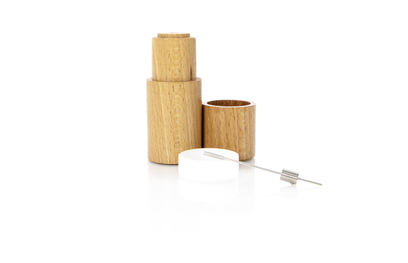 Ergänzt wird der Stab durch ein im Lieferumfang enthaltenes Messgefäß, das flexibel für verschiedene Probenmengen genutzt wird: Die Hohlform nimmt bis 5 mL auf und auf der Unterseite befinden sich konzentrische Ringe, deren Inneres bis 1,2 mL bzw. bis 0,2 mL gefüllt werden kann.